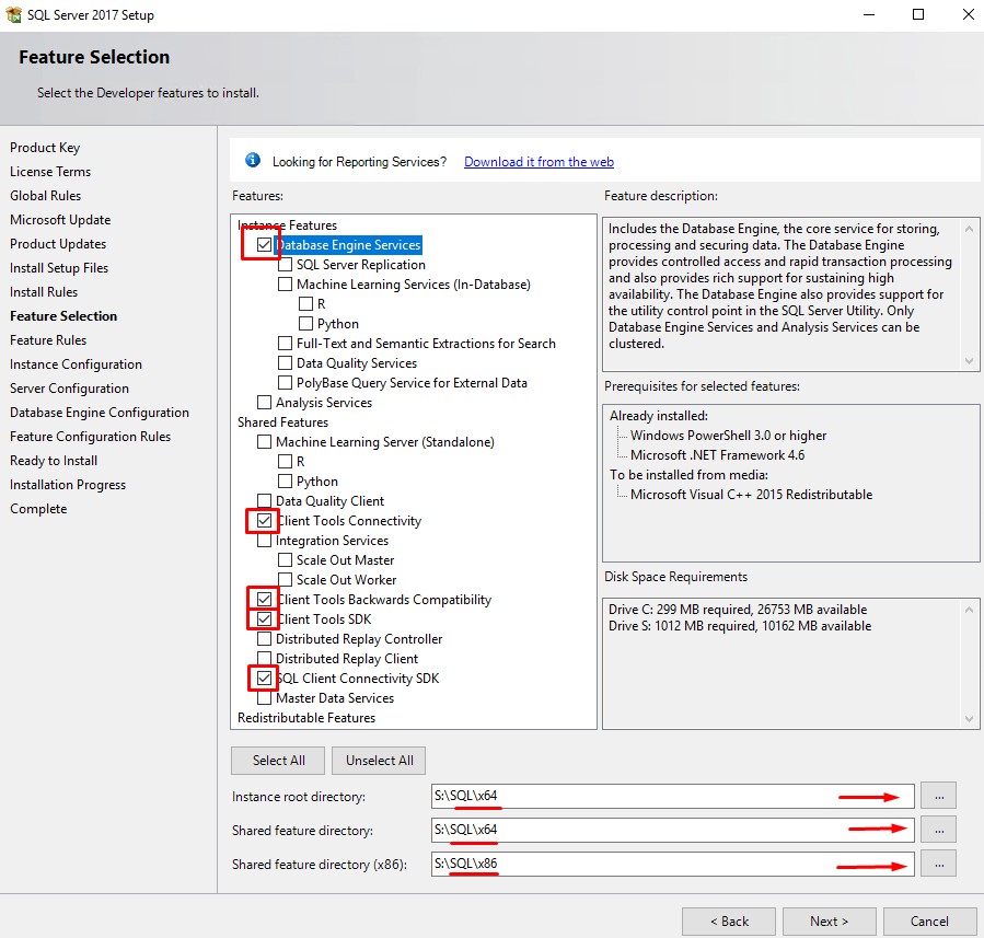 Feature Selection sekmesinde kuracağımız componentleri seçiyoruz. Bu kurulumda service olarak sadece DB Engine üzerinde duracağız bu sebeple onu seçiyoruz. Ek olarak Client erişimlerinde sorun yaşamamak için gereken diğer componentleri kuruyoruz. Son olarak kurulumun yapılacağı klasörleri belirleyip Next diyoruz.
