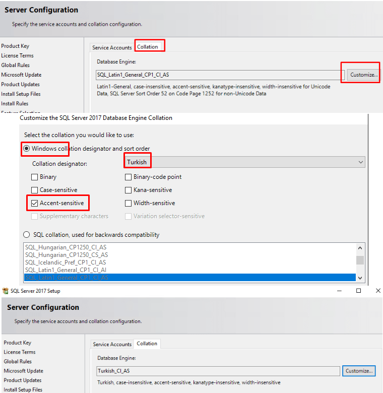 Collation kısmında ise SQL Server’ımızın default collation’ınını belirliyoruz. Burada önemli olan database’lerin collation’ı ile server collation’ının aynı olması veya uyumsuzluk sorunu olmaması.