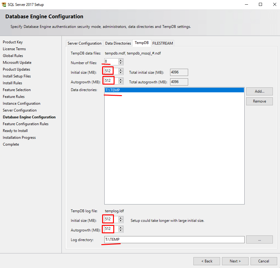 TempDB kısmında bu database için gerekli ayarlamaları yapıyoruz. Burada dikkat edilmesi gereken kaç tane data file olacağı, başlangıç boyutları ve büyüme değerleridir. Genel olarak best practice görülen CPU değeri ile 1-1 eşlenecek şekilde data file sayısı( max 8 data file) ve 64’ün katı olan dosya boyutları ve artışları kullanılmıştır. Son olarak dosyaların nerede konumlanacağı seçilmektedir. Planlama yazısında daha detaylı bir anlatım mevcuttur.
