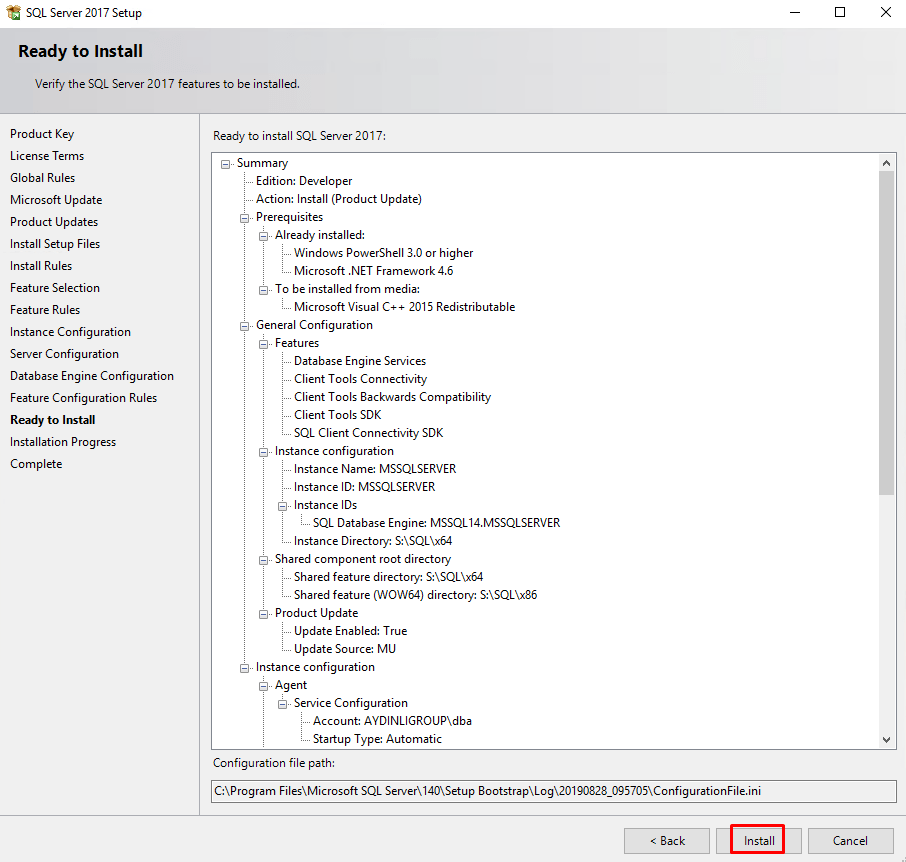 Ready to Install sekmesinde ise yapılacak işlemlerin özeti mevcuttur. Bir eksik görmüyorsak Install deyip kurulumu başlatıyoruz.