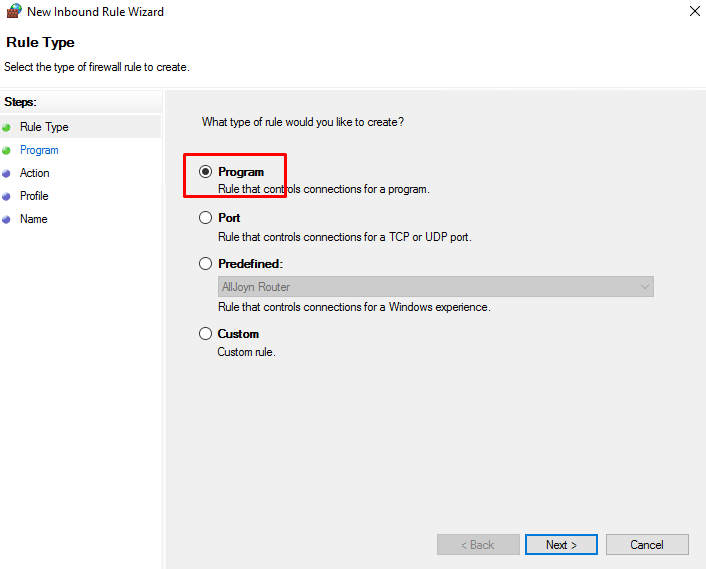 Rule Type sekmesinde Program seçeneğine tıklayıp Next diyoruz.