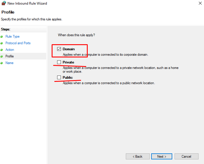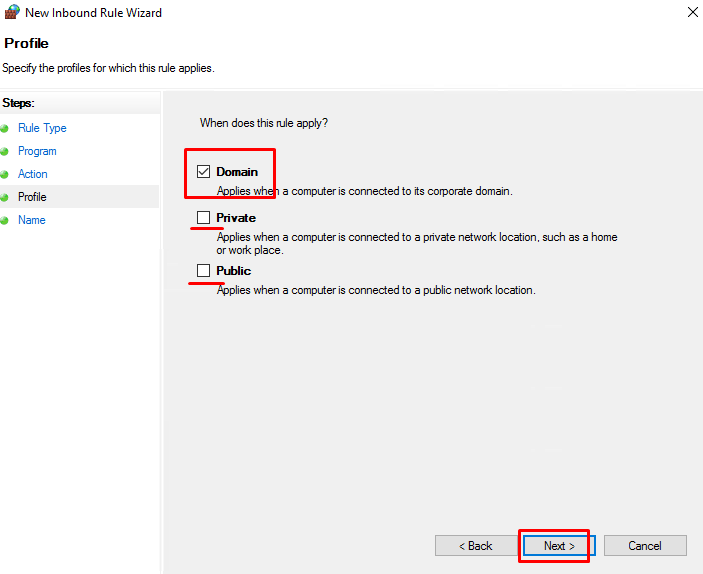 Profile sekmesinde sadece Domain seçeneğini tıklıyoruz böylece bizim domain’imize erişimi olmayan hiç bir sunucudan SQL’e bağlantı sağlanamaz.