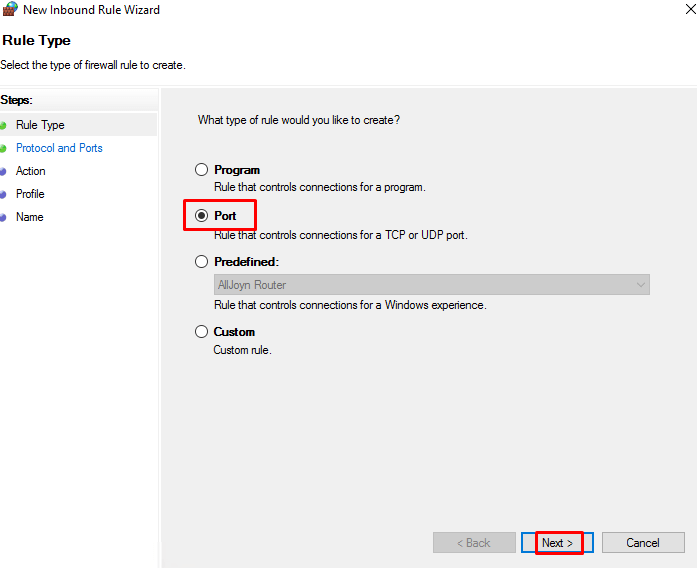 Rule Type sekmesinde Port seçeneğine tıklayıp Next diyoruz.