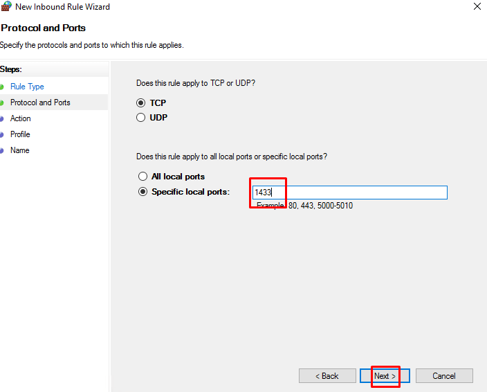 Protocol and Ports Sekmesinde TCP seçip Specific local ports kısmına MSSQL Server’ın default portu olan 1433(eğer değiştirdiysek değiştirdiğimiz portu yazıyoruz) portunu ekleyip Next diyoruz.