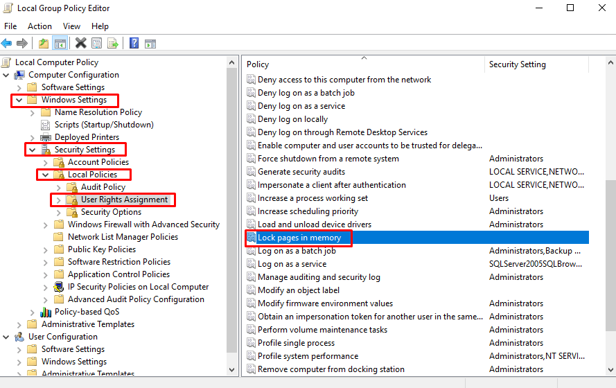 Sırasıyla Windows Settings -> Security Settings -> Local Policies -> User Right Assignment sekmelerine giderek ilk yetkimiz olan Lock pages in memory yetkisini tanımlayacağız. Adından da anlaşılacağı gibi SQL Server tarafından RAM’a alınmış pageleri SQL Server kontrolünde dilediği kadar RAM’de tutmasına izin veren bir yetkidir.