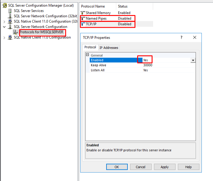 Burada sırasıyla Named Pipes (uzaktan isimle bağlanmak için) ve TCP/IP (uzaktan IP ile bağlanmak için)seçeneklerini üstlerine çift tıklayıp Enable ediyoruz