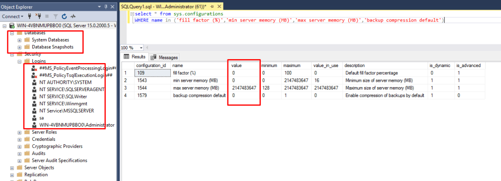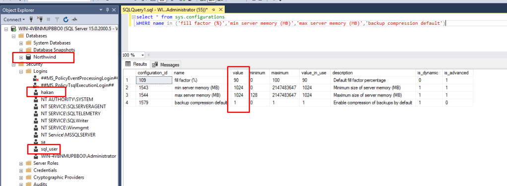 Başlamadan önce sunucumuzu inceleyelim. Senaryomuzda sunucumuzda Nortrhwind database’i mevcut,hakan ve sql_user diye iki kullanıcımız var ve configlerimize baktığımızda fill factor, min server memory vs. gibi bazı ayarlarda değişiklikler yapılmıştır. Bu ayarlar yapılırken herhangi bir best practice uygulanmamıştır tamamen değişiklikleri gösterebilmek adına kurgulanmıştır.