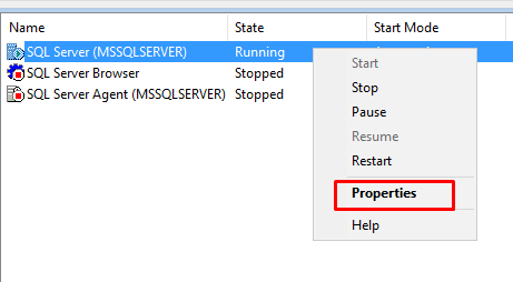 Ancak master‘ın güncel backup‘ı elimizde ise tekrardan SQL Server Configuration Manager‘ı açıp SQL servisine sağ tıklayıp Properties‘e tıklıyoruz.