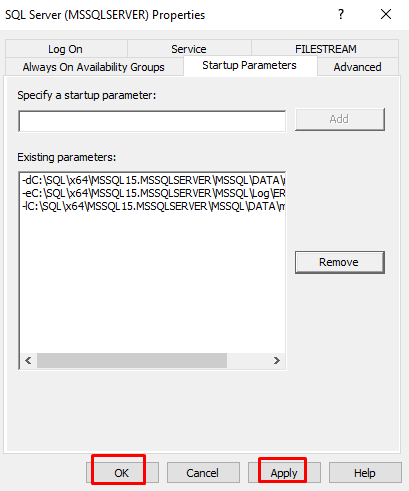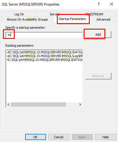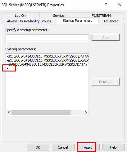SQL Server Configuration Manager‘ı açıp SQL servisine eklediğimiz -m parametresini; servisi’e sağ tıklayıp Properties‘e tıklayarak Startup Parameteres sekmesinde -m üzerine tıklayıp Remove diyerek kaldırıyoruz.