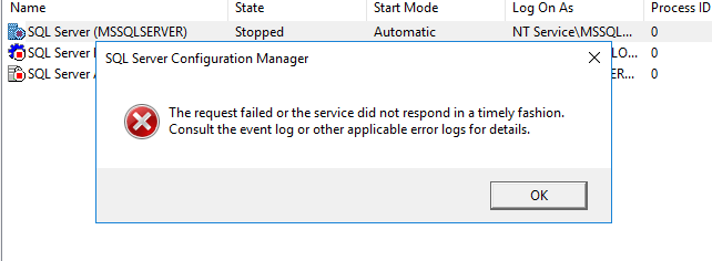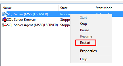 SQL Server Configuration Manager‘ı açıp SQL servisine sağ tıklayıp Start diyoruz.