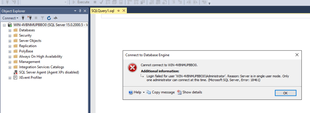 Şuan servisimizi single-user (tekil kullanıcı) modunda çalıştırıyoruz bu sebeple tek bir bağlantıya (connection) izin vereceğinden SQL Server Management Studio(SSMS) üzerinden bağlantı sağlamaya çalışırsak aşağıdaki hatayı çokça kez alacağız. Bu sebeple SSMS‘i kapatıp tekrardan cmd‘ye dönüyoruz.-cmd’yi kapattıysanız yenisini açabilirsiniz-
