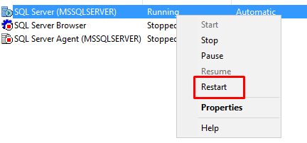 SQL Servisimizi Restart edip bağlanıyoruz.