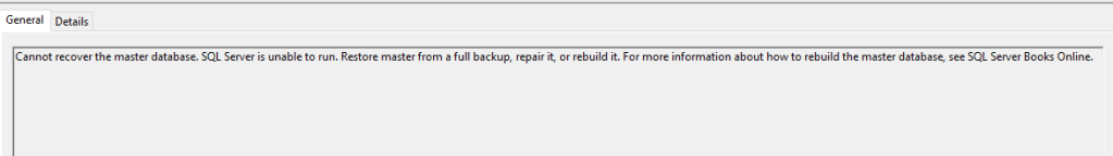 Master database’i bozulduğunda(corruption) yada dosyaları silindiğinde SQL servisini çalıştırmak istediğimizde aşağıdaki gibi bir hata alırız.