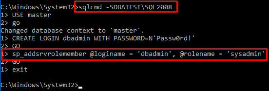 Eğer SQL Server veriyonunuz 2008 R2 ise sp_addsrvrolemember prosedürünü kullanmanız gerekmektedir. -named instance a gireken sqlcmd yazdıktan sonra -S parametresi ile sunucu ismi yazılır-
